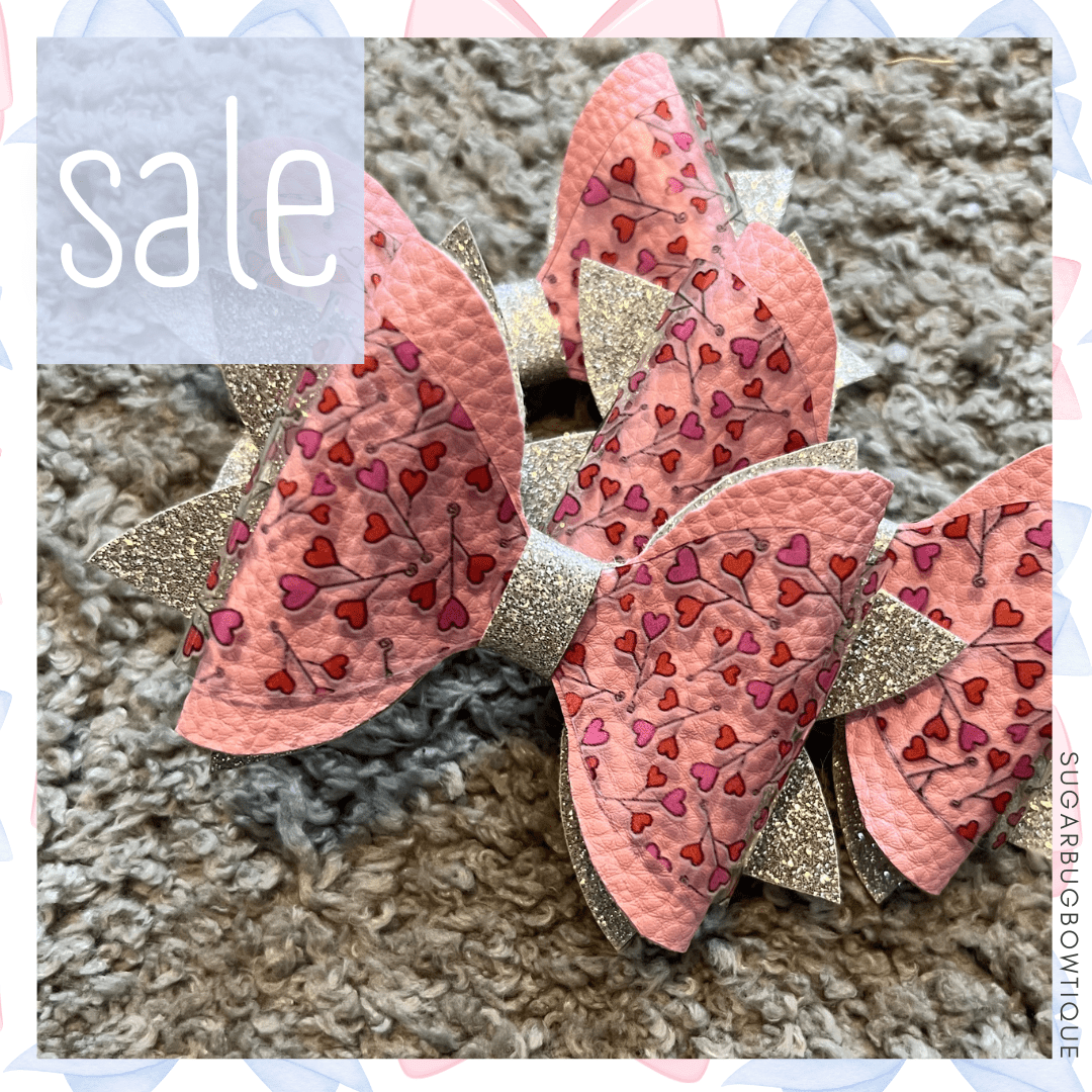 Clear Heart Bow is made up of Heart Balloon Transparent Material on Pink Leatherette backed on a silver glitter leatherette. Alligator Clip Fastening Type.