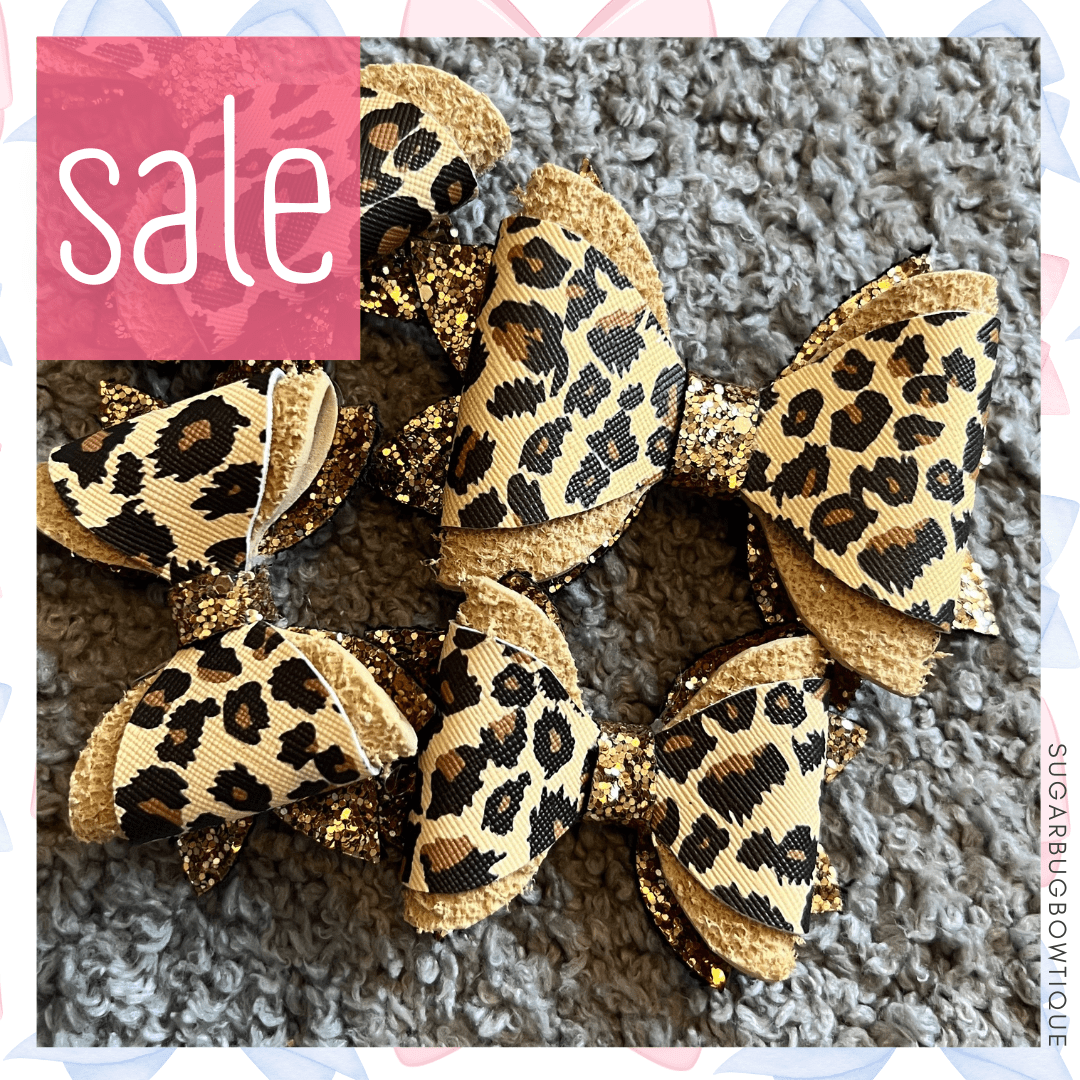 The Wild Thing Leopard Bow is made from Leopard Print leatherette on textured yellow and backed onto dark gold glitter. Alligator Clip Fastening.
